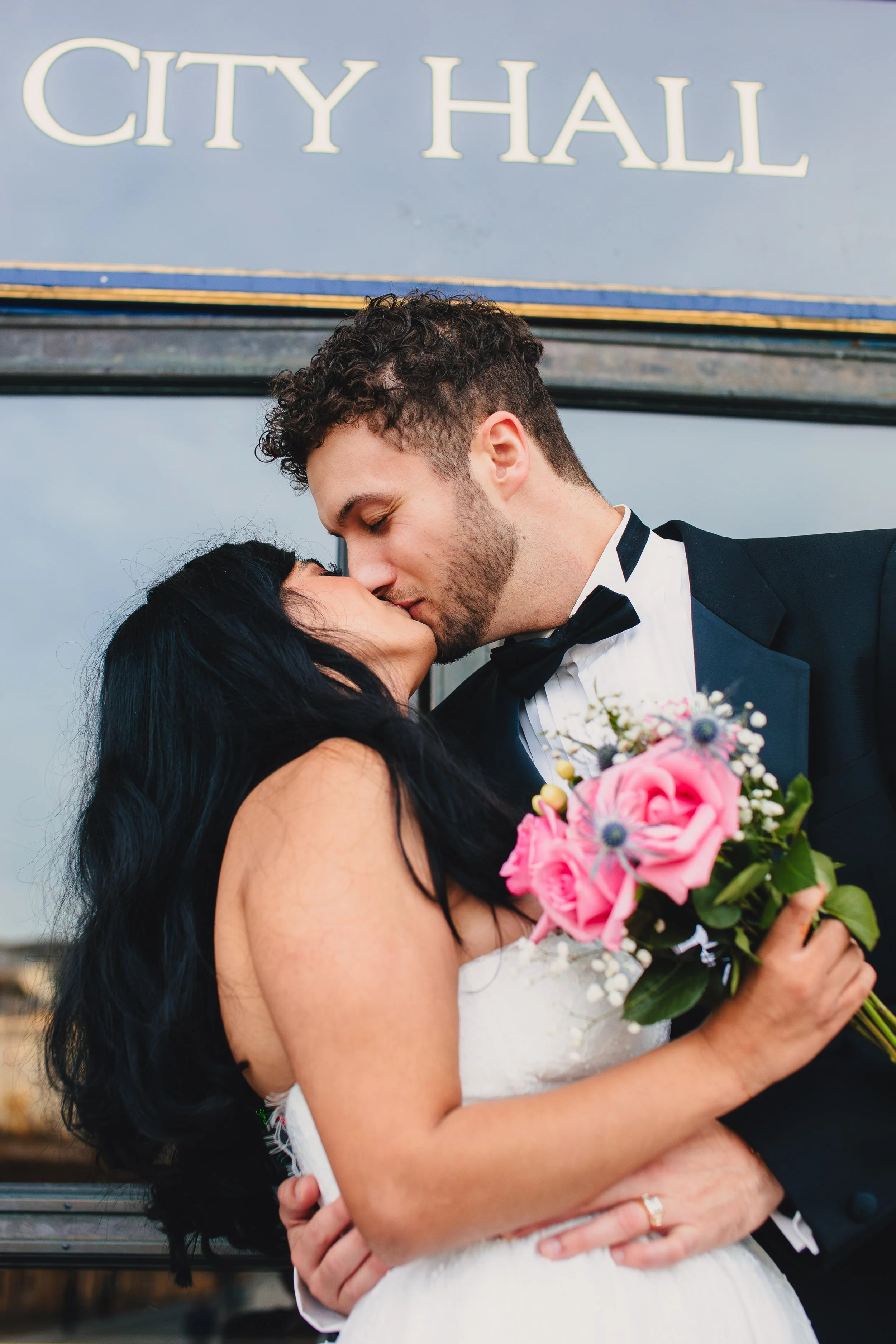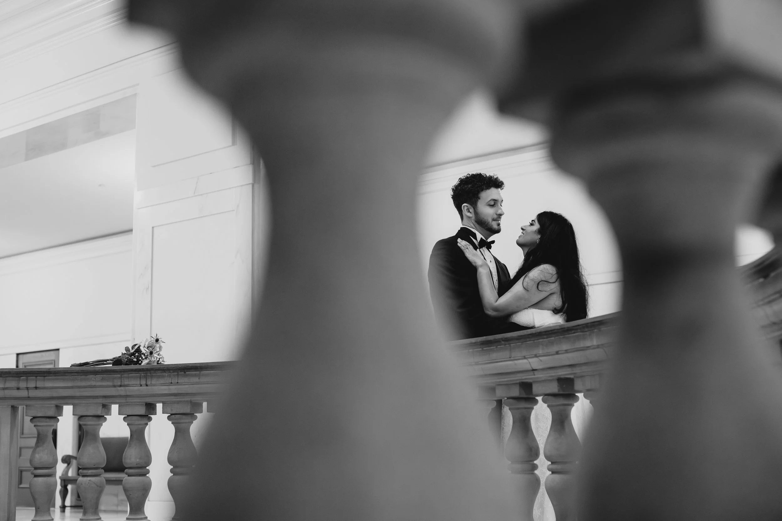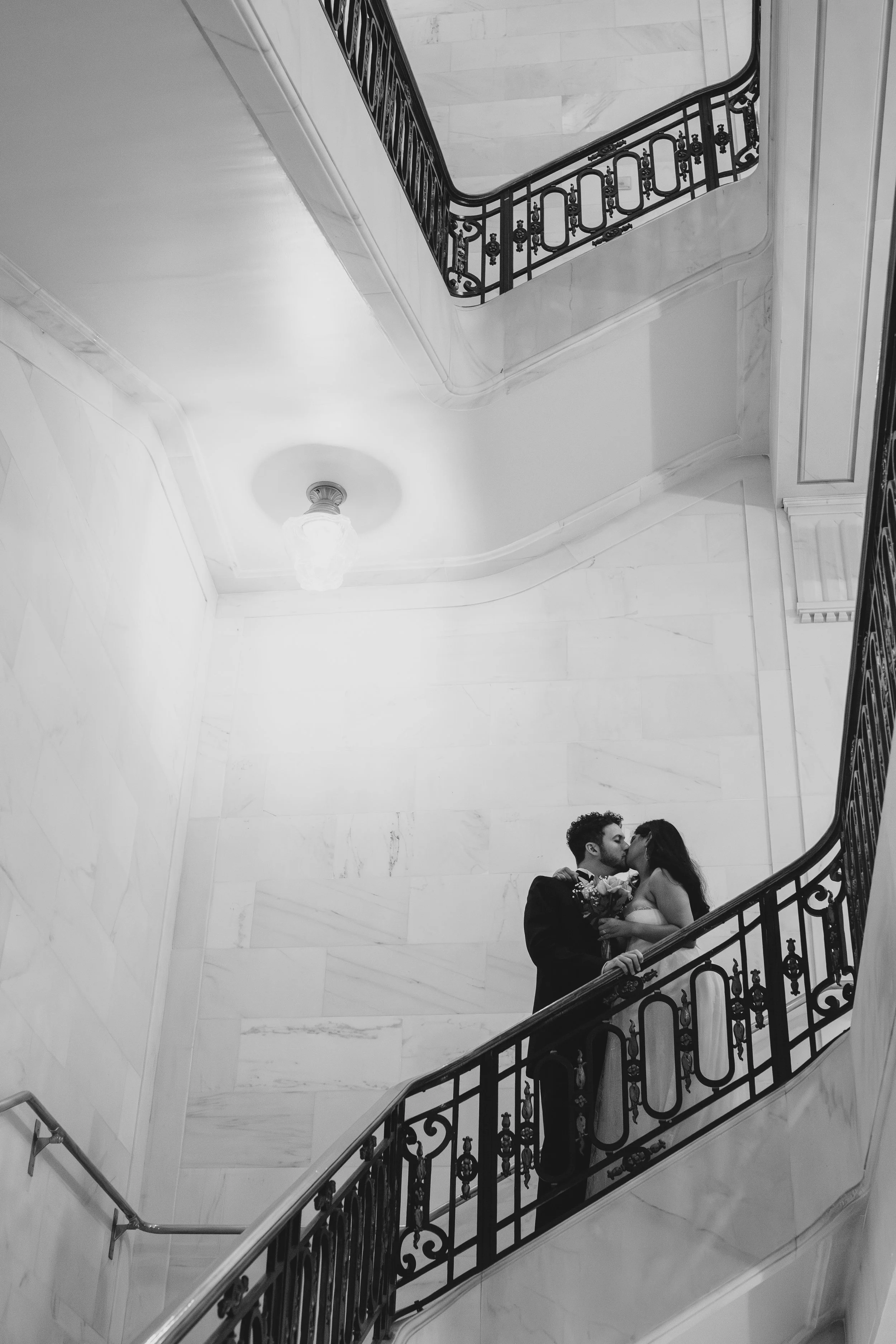 If you’ve been to City Hall, you know the Grand Staircase is usually in high demand. We got lucky: no competition, no waiting—just room to breathe. We made a handful of timeless portraits and plenty of candid moments, then slipped to a side staircase for a quieter angle that shows off City Hall’s beautiful geometry